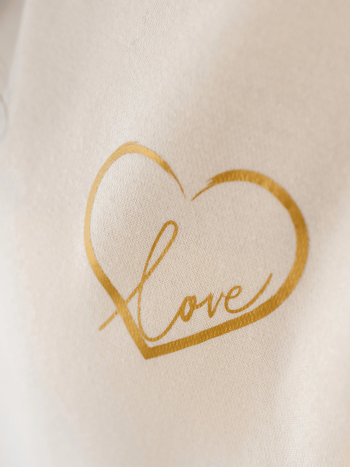 This cross-over cowl neck design embraces maximum comfort and style, made from a premium cotton-blend fabric that feels like a hug. The relaxed fit and soft fleecy lining bring calm and warmth to everyday life, while the chic metallic heart outline, with “Love” delicately framed inside, adds subtle elegance to your casual wear.